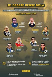 A Think Ball & Sports Consulting (www.thinkball.com.br) irá reunir grandes nomes do futebol para discutir e aprofundar temas importantes ao universo de dentro e fora das quatro linhas. O III Debate Pense Bola será no próximo dia 29 de Novembro (quinta-feira, das 15h às 19h) – CIDADE JARDIM CORP.CENTER. Torre 1 – Auditório – Av. Magalhães de Castro, 4.800 – São Paulo –..